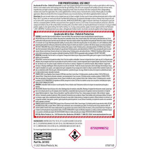 Accelerate All-In-One es un pulimento de un solo paso, diseñado para eliminar defectos de pintura leves a medianos y dejar una capa protectora. Este pulimento elimina rápida y fácilmente los remolinos, las imperfecciones y los rasguños leves, produciendo un acabado profundo y brillante. Formulado para una ventana de trabajo prolongada y una aplicación sin polvo, Accelerate se puede aplicar con un orbital, un rotatoria o a mano y es compatible con una variedad de almohadillas de espuma y aplicadores de microfibra. La fácil limpieza de este pulimento permite la aplicación en todo el vehículo antes de retirarlo.